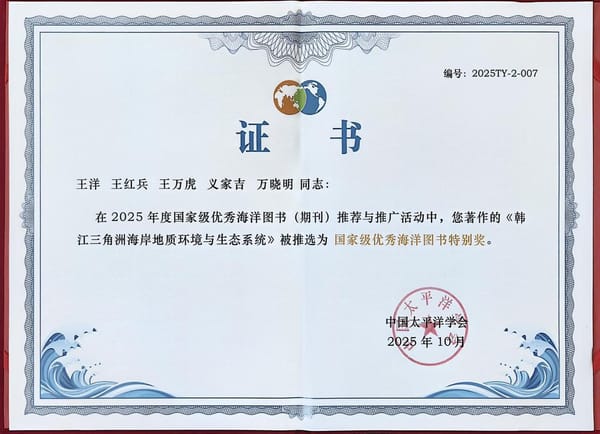 近日,在中国太平洋学会组织开展的2025年度国家级优秀海洋图书(期刊)推荐与推广活动中,中国地质调查局海口海洋地质调查中心(以下简称“海口中心”)海岸带地质调查团队编撰的《韩江三角洲海岸带地质环境与生态系统》专著,获评国家级优秀海洋图书特别奖。
