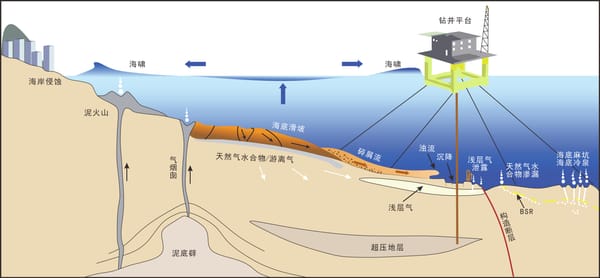 天然气水合物——这沉睡在深海或陆域永久冻土中的“能量水晶”,俗称“可燃冰”,是天然气分子被水分子搭建的“冰笼”包裹而形成的结晶化合物。据估算,全球天然气水合物的潜在储量超过1.5×1016m3,仅约3%分布在陆地上(主要分布在祁连山和西西伯利亚的多年冻土带),其余则深藏在大陆坡和陆隆的海底地层中。可别被它晶莹的外表迷惑!当海洋升温或者压力骤减时,这些固态“水晶”便会分解,就像突然拧开的海底香槟瓶,封存的天然气如气泡般喷涌而出,引发一系列的深海危机——甲烷气体渗漏、海底失稳滑塌等。天然气水合物分解在海底浅层局部聚集形成的“浅层气”,如同往土体中注入了“疏松剂”。在遭遇地震、台风等触发因素时,含气沉积物发生液化蠕变,拽着地层下陷、侧滑甚至崩塌。天然气水合物分解产生的甲烷流体,沿着泥火山、沉积物裂隙或断层向上运移和排放,便会形成“冷泉”,位于琼东南盆地西部海域的“海马冷泉”便是一个典型代表。天然气水合物分解释放的甲烷气体不仅会助推全球变暖,大规模的逸散更会让地层迅速沉降,引发的大规模海底滑坡,足以掀翻海上施工平台。研究表明,近年来的气候变化正在降低海底天然气水合物的稳定性,人类的工程也暗藏隐患。铺设海底管道带来的温压扰动可能触发天然气水合物的分解,引起滑塌导致管道断裂;天然气水合物的分解同时也加速了海底钢结构的腐蚀。