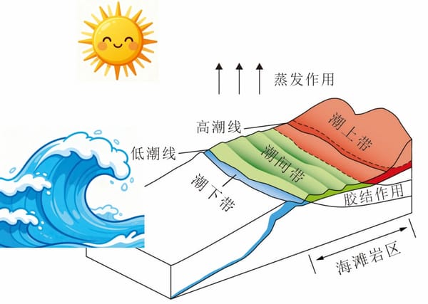 地形与空间:海滩岩主要形成于平缓海岸带(坡度1°-5°),理想地形是平缓的砂质海滩、砾石质海滩、砂-砾混合海滩,或河口附近的缓坡三角洲前缘。其成岩空间需是满足“半淹没-半暴露”的微地形,因此潮间带是最核心的成岩微地形。